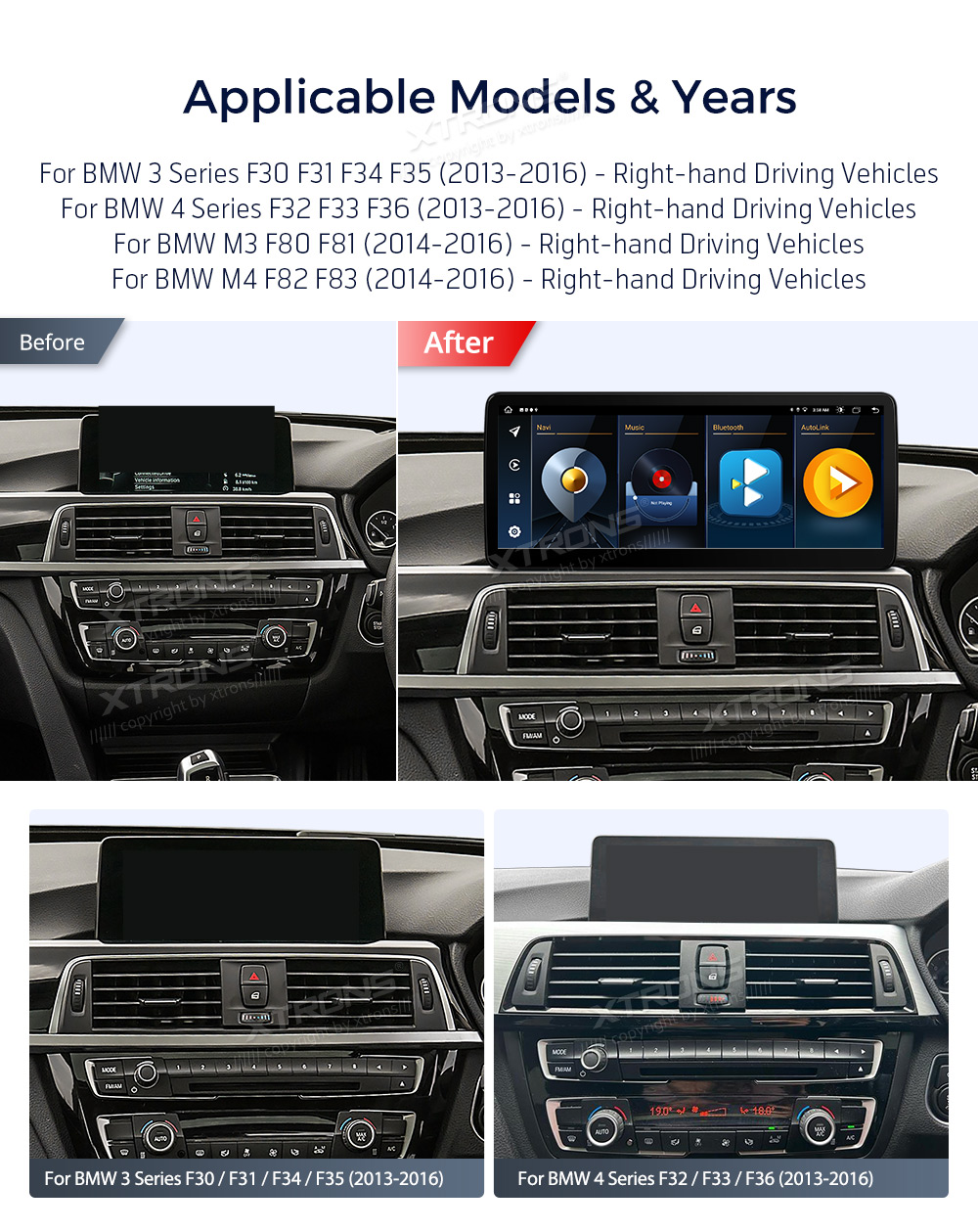 This unit ONLY works with the original 3 Series F30 F31 F34 F35 / 4 Series F32 F33 F36 / M3 F80 F81 /M4 F82 F83 Right-hand Driving Vehicles NBT system.