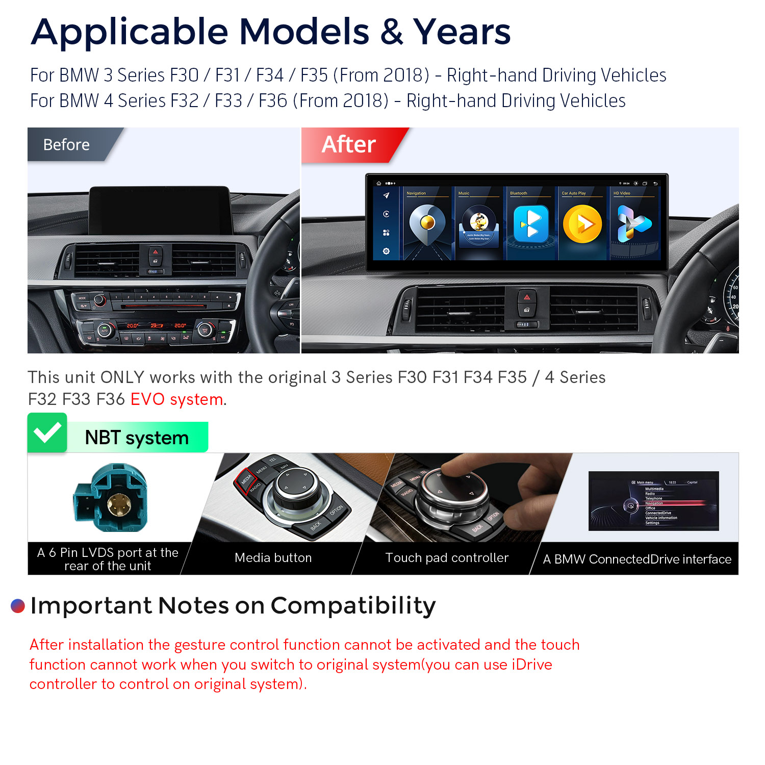 This unit ONLY works with the original BMW 3 series F30 F30 F34 F35 / 4 series F32 F33 F36 EVO system