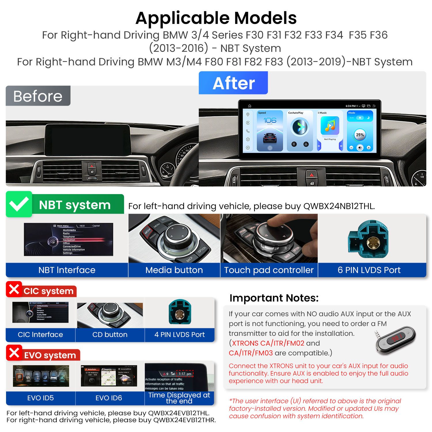 1. This unit ONLY works with the original BMW NBT system. A NBT system car radio usually comes with Media button, touch pad controller, a 6-pin LVDS port and a BMW NBT Interface.