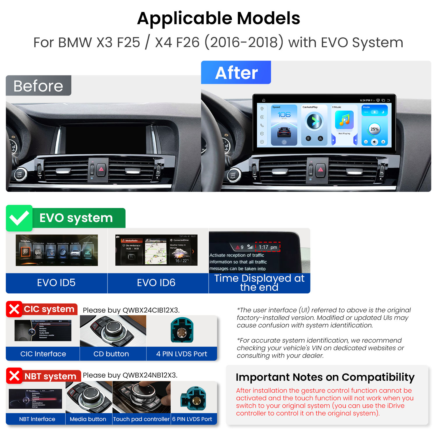 1. This unit ONLY works with the original BMW EVO system. A EVO system car radio usually comes with EVO ID5 /EVO ID6 Interface and time displayed at the end.