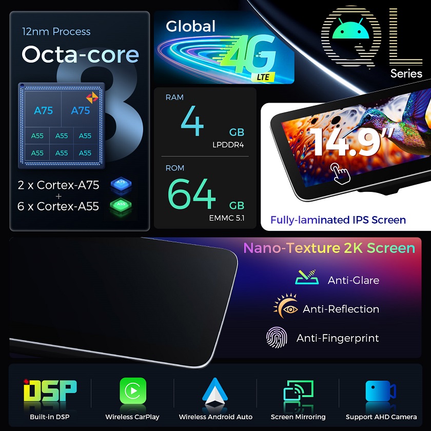 Immerse yourself in brilliance with our 14.9″ Grade-A 2K IPS screen. Enjoy vibrant colours, sharp clarity and expansive visuals with its ultra-wide 32:9 aspect ratio. Seamlessly access content and apps without tab-switching for ultimate driver convenience.