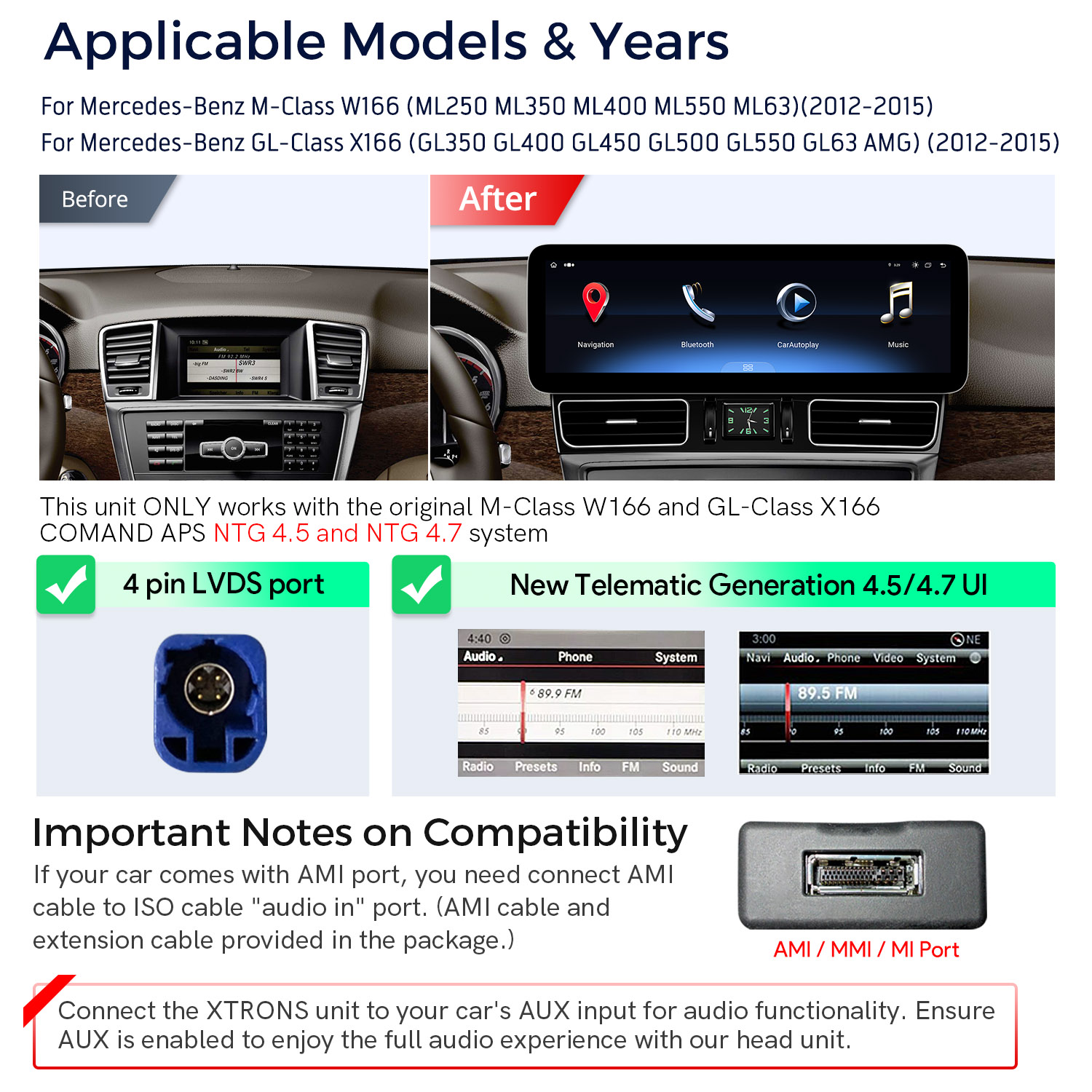 This unit ONLY works with the original Mercedes-Benz M-Class W166 and GL-Class X166 COMAND APS NTG4.5 and NTG4.7 systems that have the following features: a 4-pin LVDS port or a New Telematic Generation 4.5/4.7 UI.