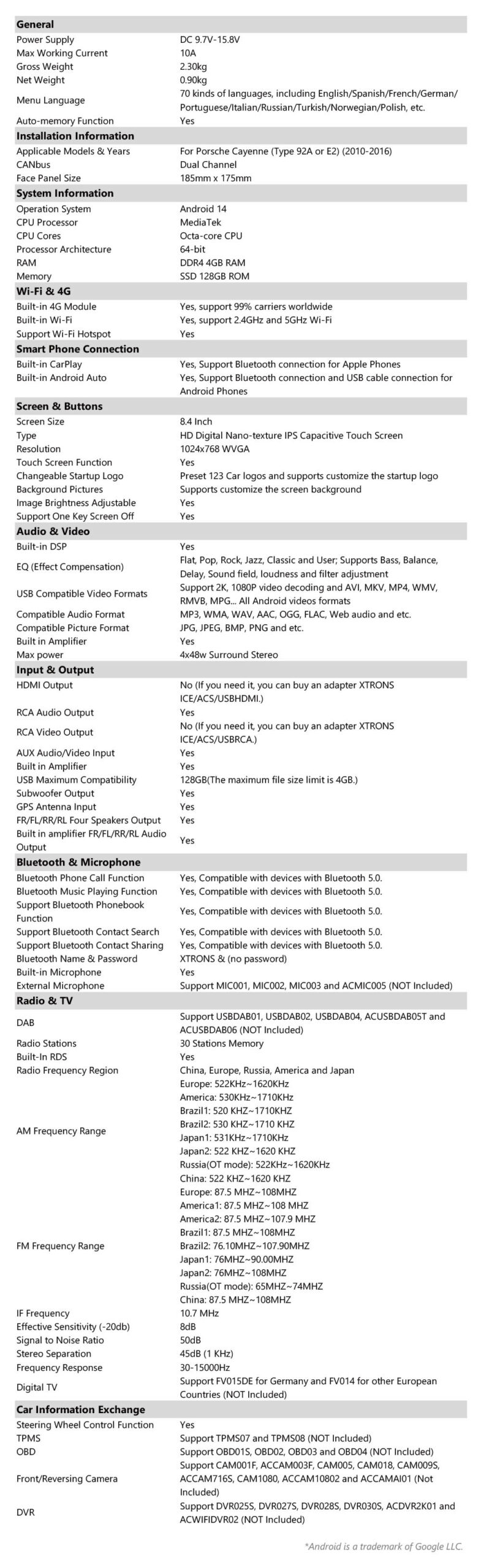 Android Octa Core 4GB DDR4 RAM + 128GB Solid State ROM 8.4” 1024×768 IPS Nano Texture Screen Car Stereo Multimedia Player GPS Navigation System Built-in CarPlay & Android Auto & DSP Screen Mirroring High Power TDA7851 Amplifier USB Tethering TDA7708 RDS Radio Support AHD Camera Custom Fit for Porsche Cayenne