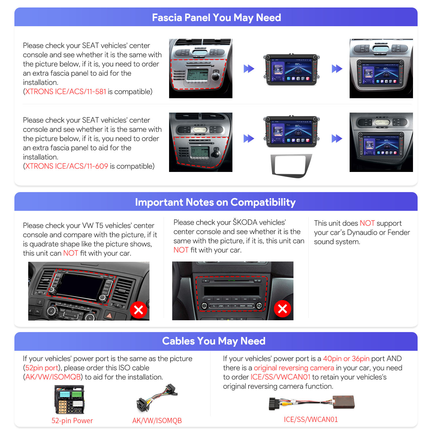 Please check to see whether your vehicle’s power port is 40pin/36pin and there is an original reversing camera in your car. If so, you will need this ISO Cable - ICE/SS/VWCAN01.