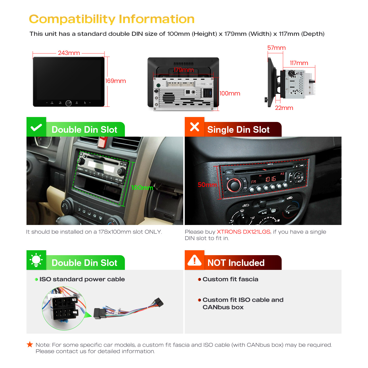 1. For some specific car models, a custom fit fascia and ISO cable (with CANbus box) may be required. Please contact us for detailed information.