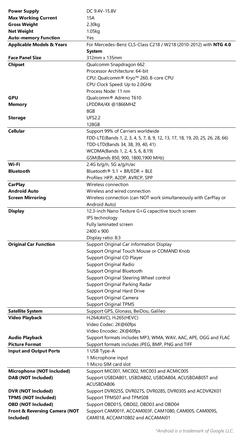 Mercedes-Benz | Android / iPhone | Octa-core | 4GB RAM & 64GB ROM | Integrated 4G LTE | QLM2245M12CLS