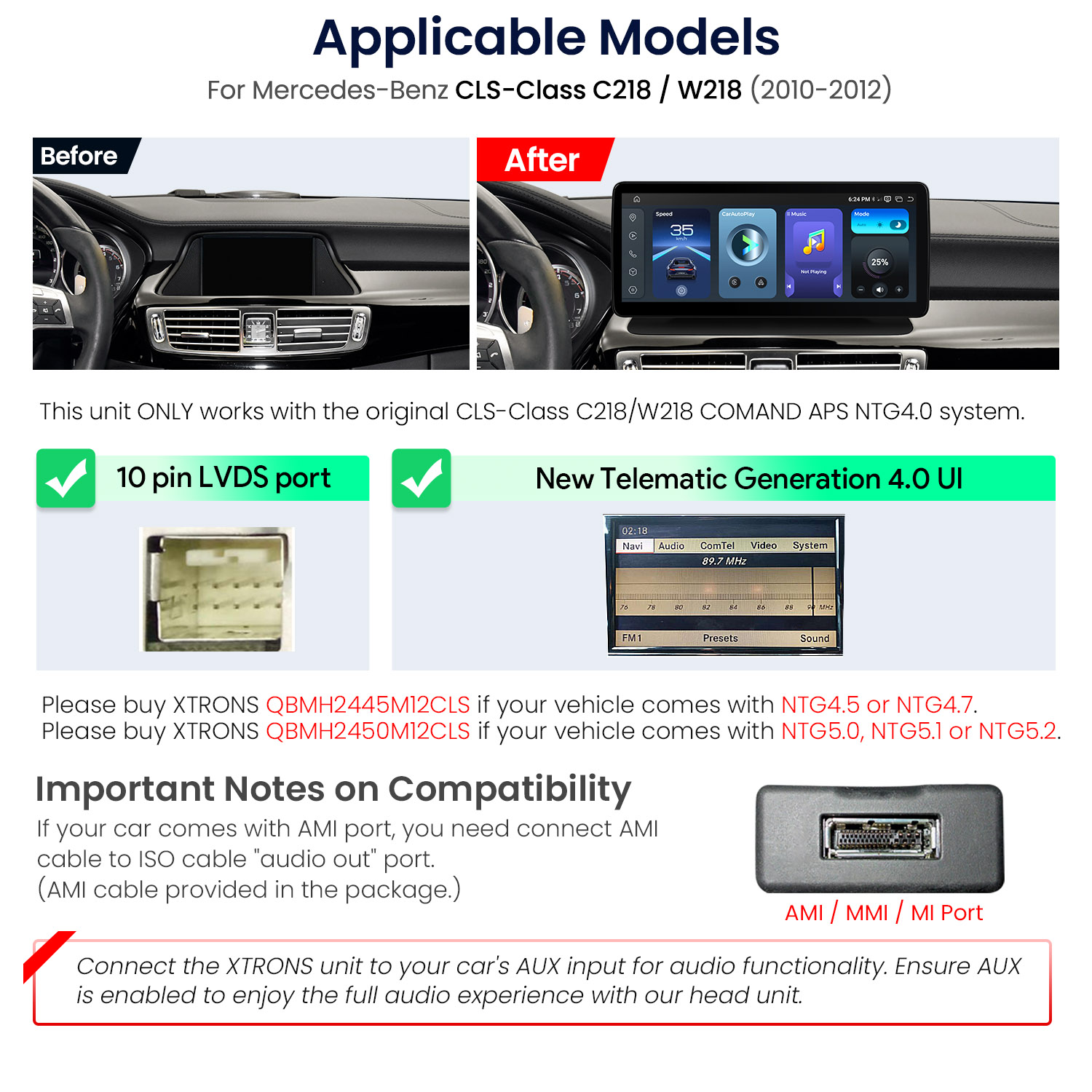 1. This unit ONLY works with the original Mercedes-Benz CLS-Class C218 / W218 COMAND APS NTG4.0 system which has the following features: a 10-pin LVDS port or a New Telematic Generation 4.0 UI.