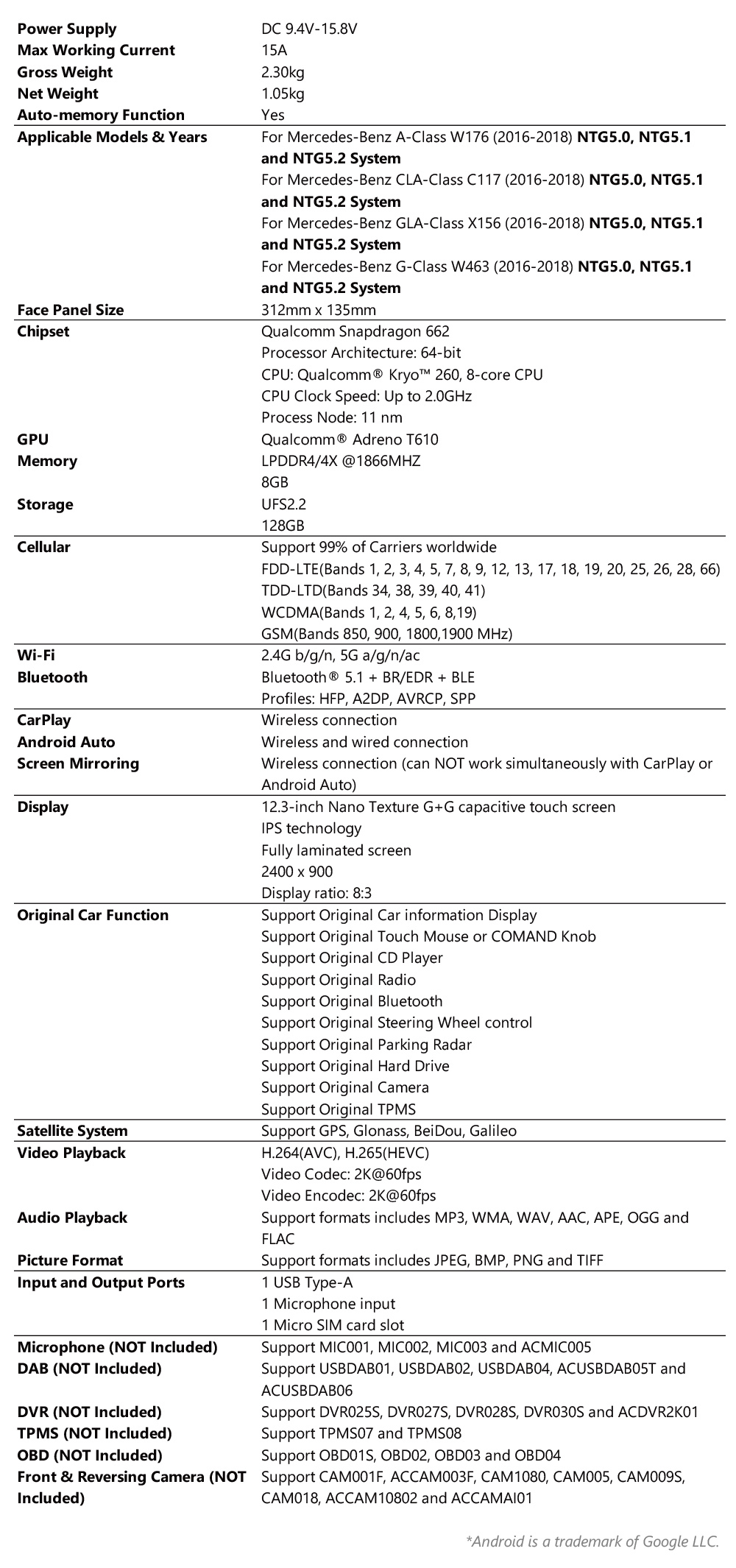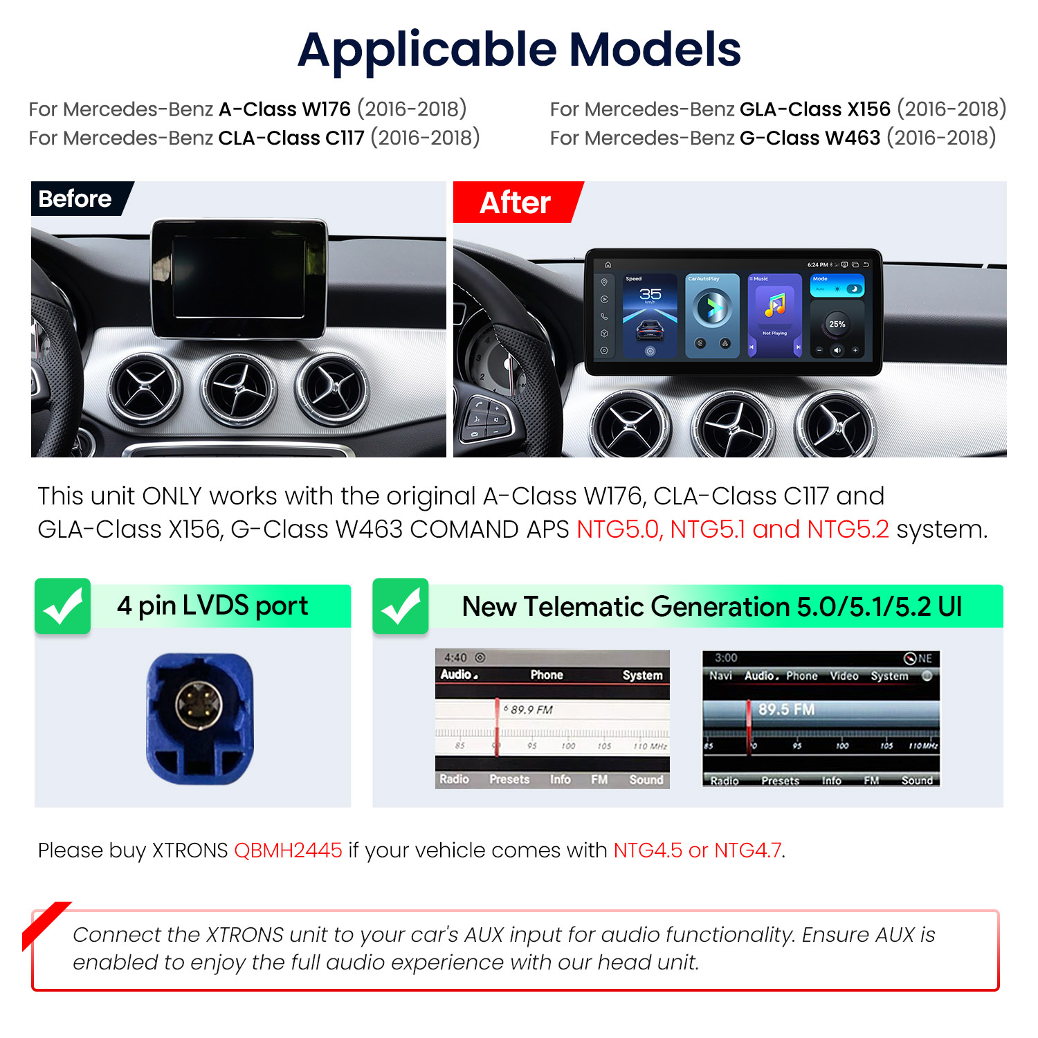 1. This unit ONLY works with the original Mercedes-benz A-Class W176, CLA-Class C117, GLA-Class X156 and G-Class W463 COMAND APS NTG5.0, NTG5.1 or NTG5.2. Please make sure your vehicle's original system is COMAND APS NTG 5.0, NTG5.1 or NTG5.2 before purchasing. A NTG5.0, NTG5.1 or NTG5.2 system usually has a 4 pin LVDS port and new Telematic Generation 5.0, 5.1 or 5.2 UI