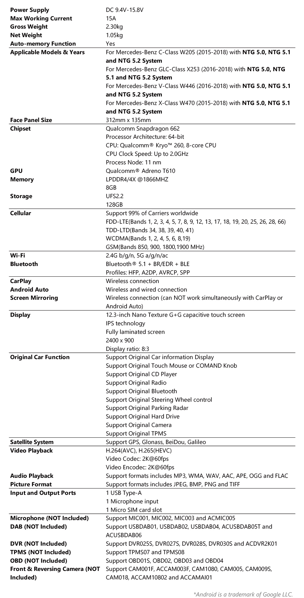 For Mercedes-Benz V-Class W446 (2016-2018) with NTG5.0, NTG5.1 or NTG5.2 System