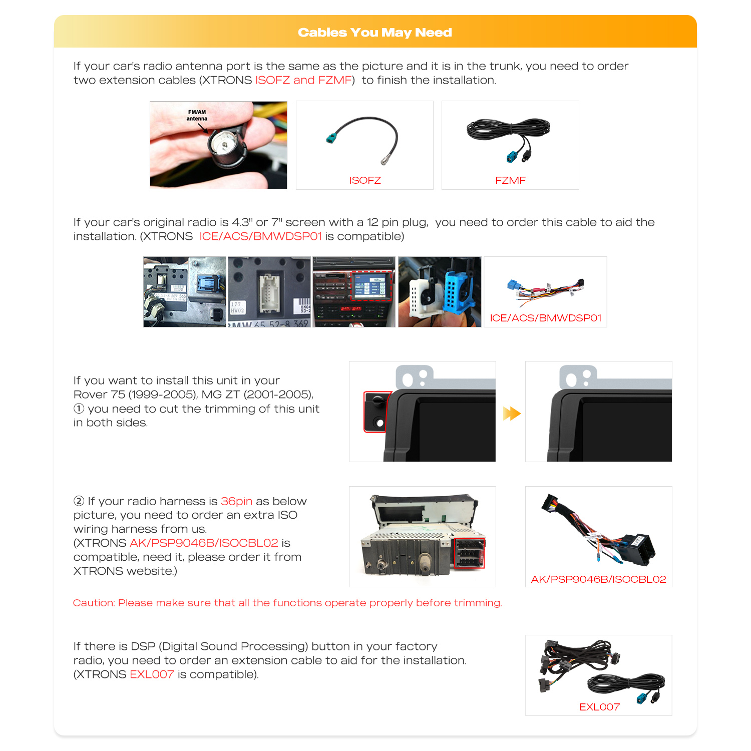 - If you want to install this unit in your Rover 75 (1999-2005), MG ZT (2001-2005), you need to cut the trimming of this unit in both sides. Also, if your radio harness is 36pin, you need to order an extra ISO wiring harness from us. (XTRONS AK/PSP9046B/ISOCBL02 is compatible)Â Caution: Please make sure that all the functions operate properly before trimming.Â