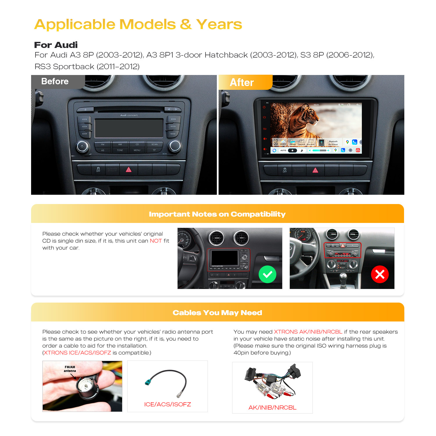 - If there is static noise or no sound in the rear speakers after installing this unit, you may need XTRONS AK/INIB/NRCBL to fix it. (Please make sure the original ISO wiring harness is 40-Pin.)