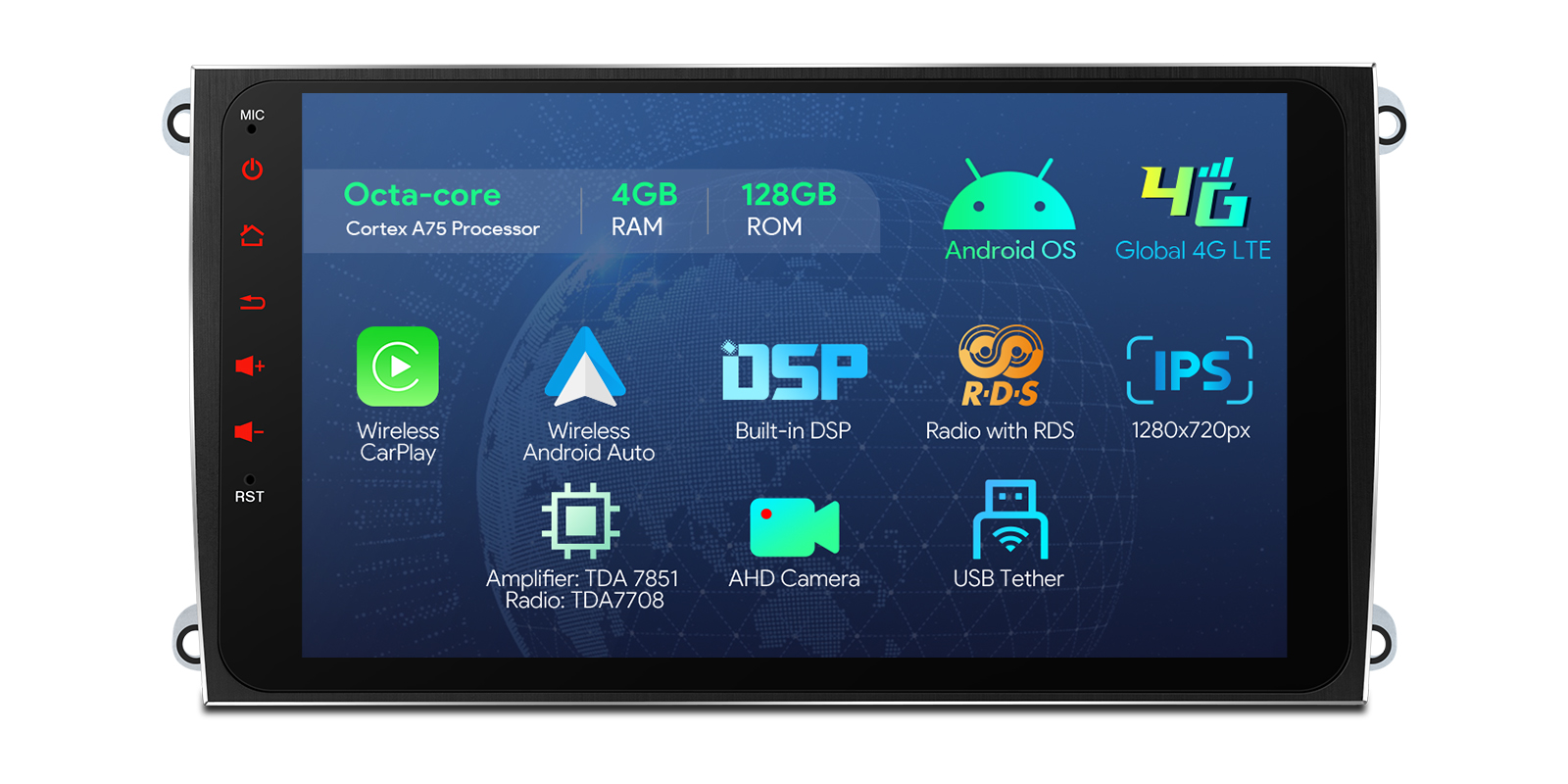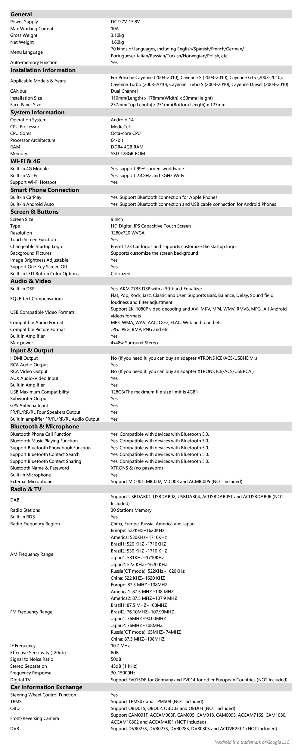 Android Octa Core 4GB DDR4 RAM + 128GB Solid State ROM 9” 1280×720 IPS Screen Car Stereo Multimedia Player GPS Navigation System Built-in CarPlay & Android Auto & DSP Screen Mirroring High Power TDA7851 Amplifier USB Tethering TDA7708 RDS Radio Support AHD Camera Custom Fit for Porsche Cayenne