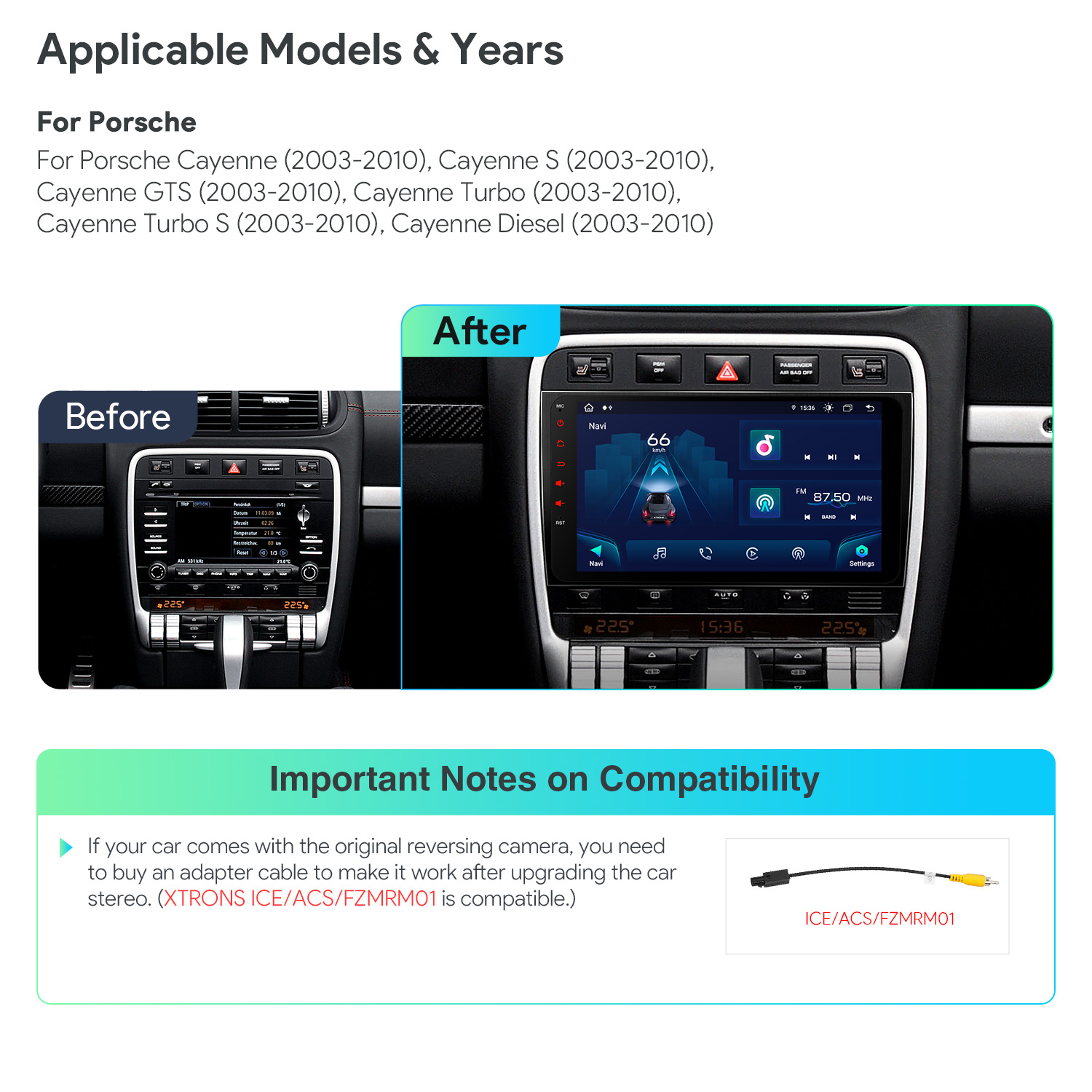 If your car comes with the original reversing camera, you will need an adapter cable to make it work after upgrading the car stereo. (XTRONS ICE/ACS/FZMRM01 is compatible.)